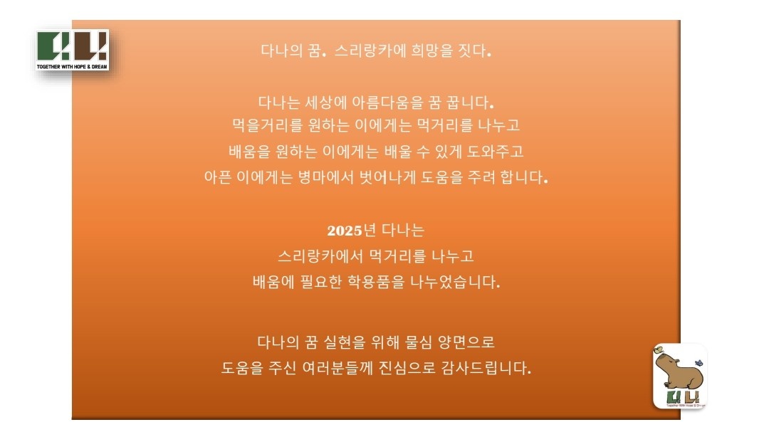 몇년간 후원해온 스리랑카지역 학교건립사업에 이어 이번에는 학생들이 공부하는데 필요한 기자재, 냉방기구, 학용품 및 식료품을 지원하였습니다.아무리 주고 또 주어도 모자라기만 한 후원사업에 도움을 주시는 고마우신 분들 덕분에 이 곳에서 공부하게 될 아이들은 꿈을 꿀 수 있